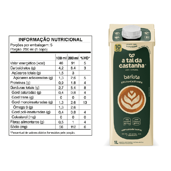 O A Tal da Castanha Barista é a alternativa vegetal perfeita para suas criações com café. Desenvolvido para criar a crema ideal, ele oferece textura e corpo incríveis, seja em bebidas quentes ou frias. Livre de aditivos artificiais, gomas, conservantes, soja, lácteos e glúten, é ideal para profissionais e apaixonados por café que buscam sabor e qualidade em um produto clean.