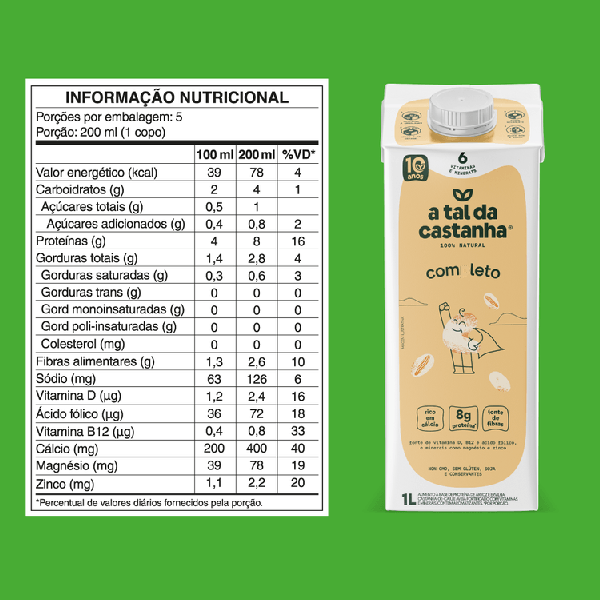 Ingredientes: Água, proteína de arroz, castanha-de-caju, proteína de ervilha, farinha de aveia sem glúten, fosfato tricálcico (cálcio), sais de magnésio de ácido cítrico (magnésio), sal marinho, sulfato de zinco monoidratado (zinco), ergocalciferol (vitamina D2), cianocobalamina (vitamina B12), ácido N-pteroil-L-glutâmico (ácido fólico) e aromas naturais.