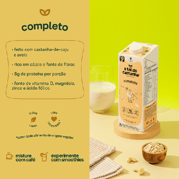 O Completo é uma bebida vegetal desenvolvida para oferecer nutrição prática e completa em qualquer momento do dia. Feito com proteína de arroz e ervilha, castanha-de-caju e aveia sem glúten, é fortificado com cálcio, magnésio, zinco, vitamina D, vitamina B12 e ácido fólico. Com 8g de proteína por porção, fibras alimentares e baixo teor de açúcares e gorduras, é 100% vegetal, sem lactose, sem glúten e sem colesterol, ideal para quem busca equilíbrio, sabor e versatilidade na rotina.