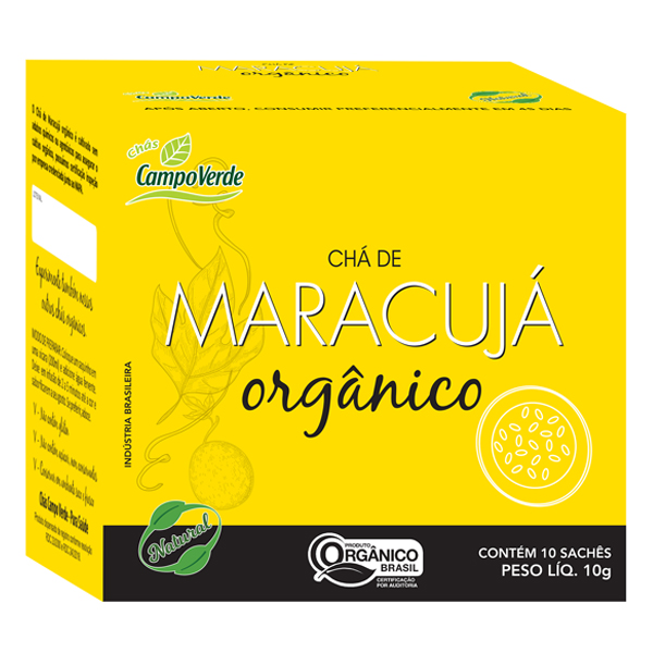 O Chá de Maracujá Orgânico Campo Verde é cultivado sem adubos químicos ou agrotóxicos. Ele vem em sachês, de 10 unidades por caixa.