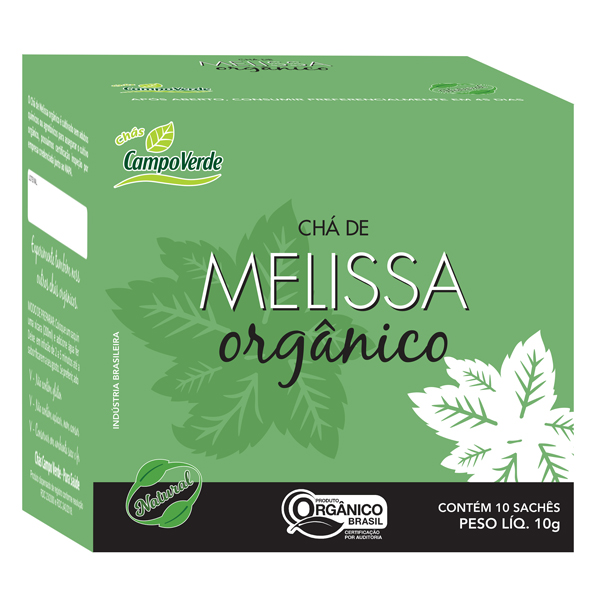O Chá de Melissa Orgânico Campo Verde é cultivado sem adubos químicos ou agrotóxicos. Ele vem em sachês, de 10 unidades por caixa.