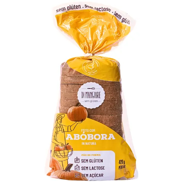 Pão de abóbora zero açúcar, 420g, sem glúten, sem leite/lactose e de baixo valor calórico. Leva abóbora in natura em sua composição. Rico em vitamina A e C e carotenoides.