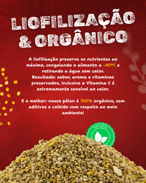 O Pólen Apícola Liofilizado MN Própolis passa por um processo especial de desidratação a frio, chamado liofilização, que preserva suas propriedades naturais. Rico em mais de 20 aminoácidos essenciais, além de vitaminas, minerais, fibras e antioxidantes, ele é considerado um superalimento completo.